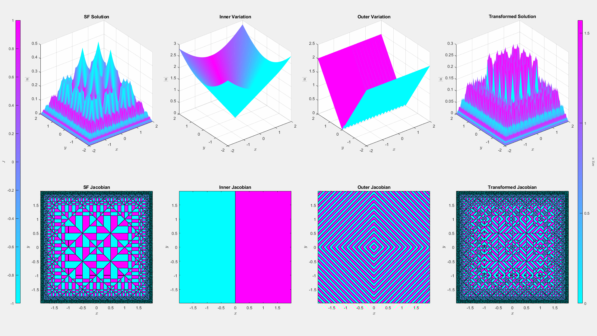 On the left we plot the original solution. In the middle we plot additional maps that, when composed with the original solution, preserve the PDI and boundary condition. The animations runs through several examples of these maps. On the right we then plot the result of this composition.